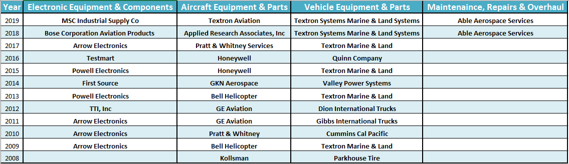 by Federal Defense IndustriesMoorpark, CA (January 27, 2020) – Federal Defense Industries (FDI) is pleased to name the recipients of its annual Outstanding Supplier Awards for 2019. The awards recognize outstanding performance by suppliers working with FDI to support a special segment of the defense industry. The awards are in four categories: Aircraft Equipment and Parts, Vehicle Equipment and Parts, Electronic Equipment and Components, and Maintenance, Repairs and Overhaul.